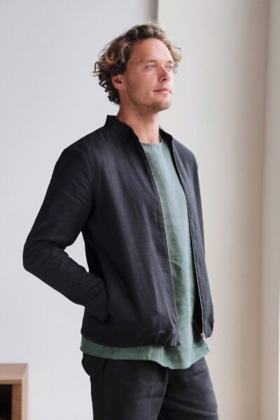Men's linen bomber jacket. Color in the picture – Black. This trench is made from 100% Linen and is available