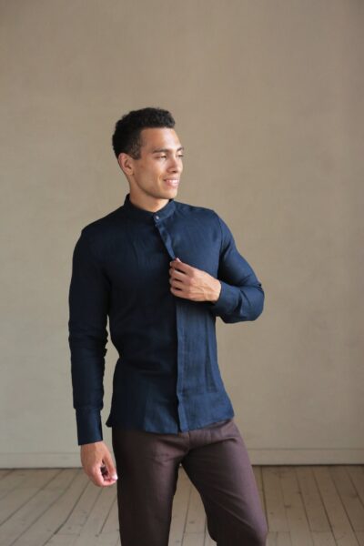 Dark blue linen men's hidden botton dress shirt. Gifts for him! Classic handmade men's shirt. Comfortable and stylish men's shirt.