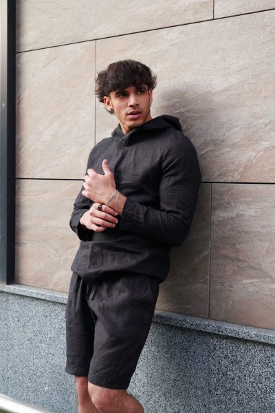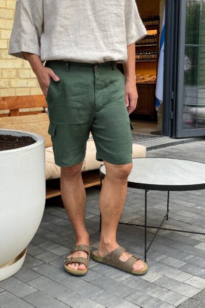 Linen men's short shorts with patch pockets. Color in the picture – Black. Loose-fit shorts are made from 100% Linen