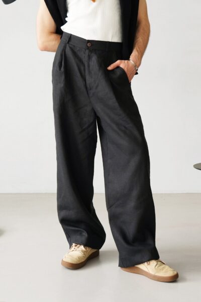 Wide men's linen joggers with pleats and zip. High-waisted pants. Color in the picture – Black. 📏This model of the