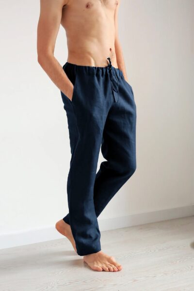 Men's linen pants. Dark-blue pants with pockets. Natural Linen pants make a luxurious and functional gift for that special man