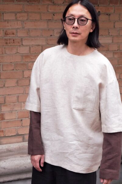 Linen men's t-shirt with double-layer sleeve. Color in the picture – Beige (uncolored) + Brown sleeves. This T-shirt is versatile,