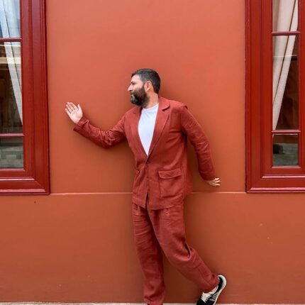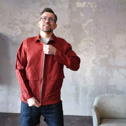 Men's linen bomber jacket with patch pockets. Color in the picture – Terracotta. This jacket is made from 100% Linen