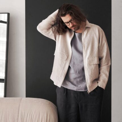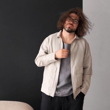 Men's linen bomber jacket with patch pockets. Color in the picture – Beige. This jacket is made from 100% Linen