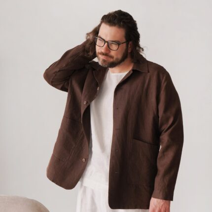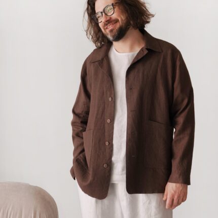 Men's linen bomber jacket with patch pockets. Color in the picture – Brown. This jacket is made from 100% Linen