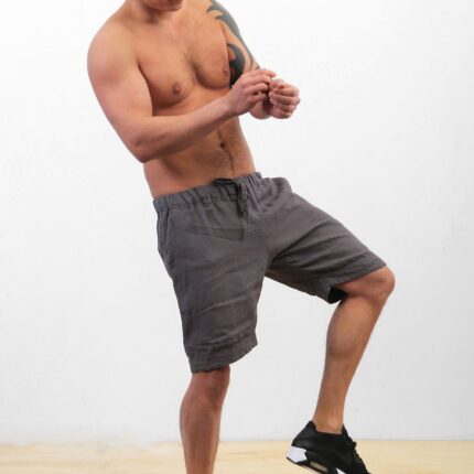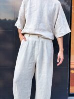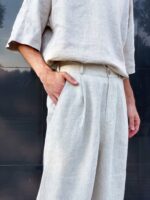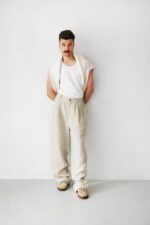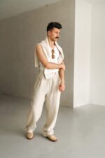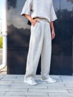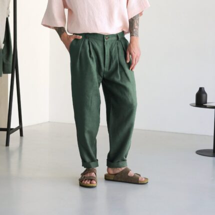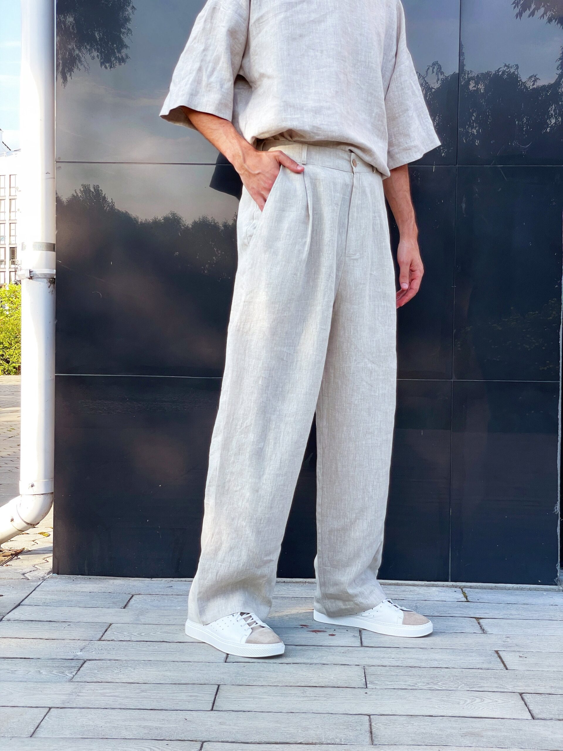 Wide men's linen joggers with pleats and zip. High-waisted pants.