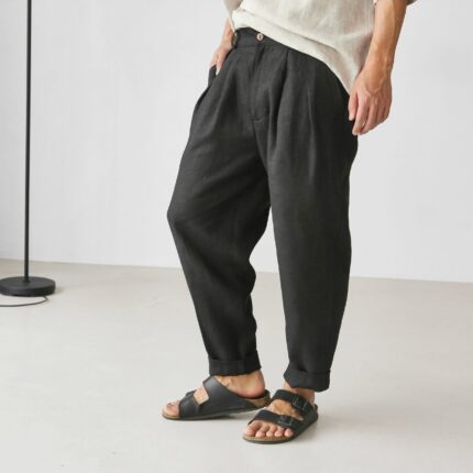 Drawstring Linen Pants Soft Pleats Linen for Men Relaxed Cut