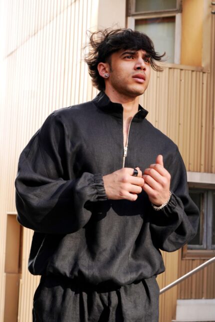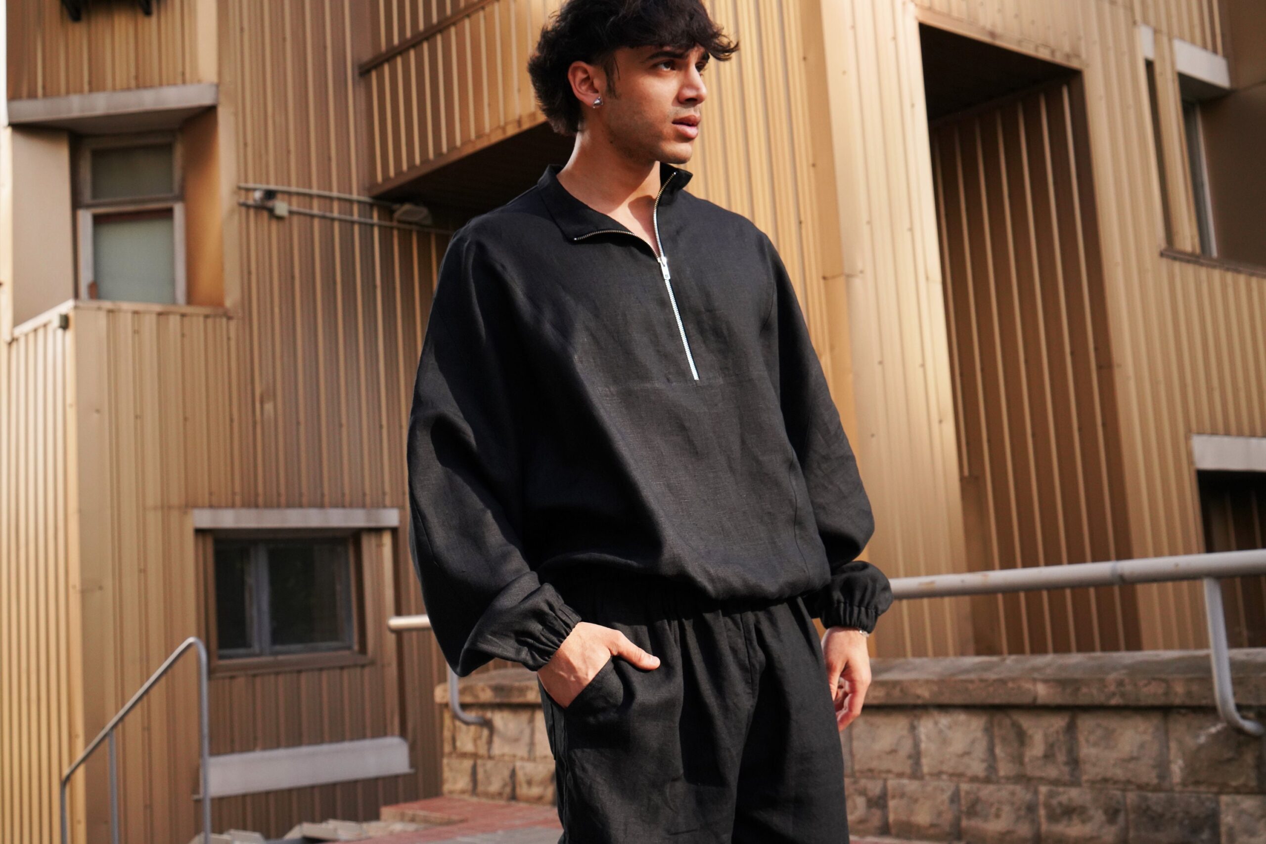 Men's linen sweatshirt with the drop shoulder sleeve and zip.