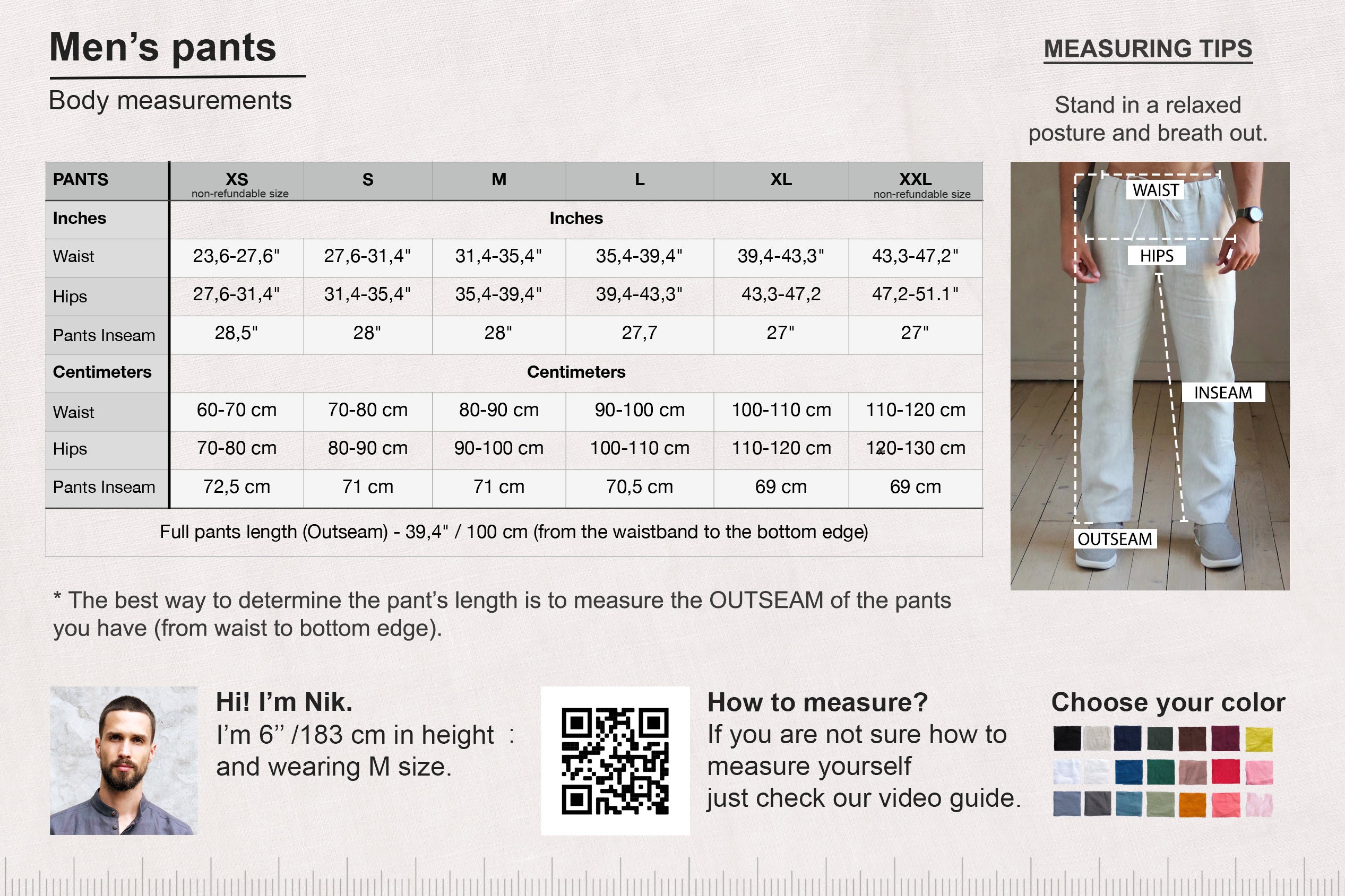 These pants are versatile, they are cozy and comfortable outdoors as well as at home. The fabric is breathable and takes the body shape, over time it becomes softer and more pleasant.