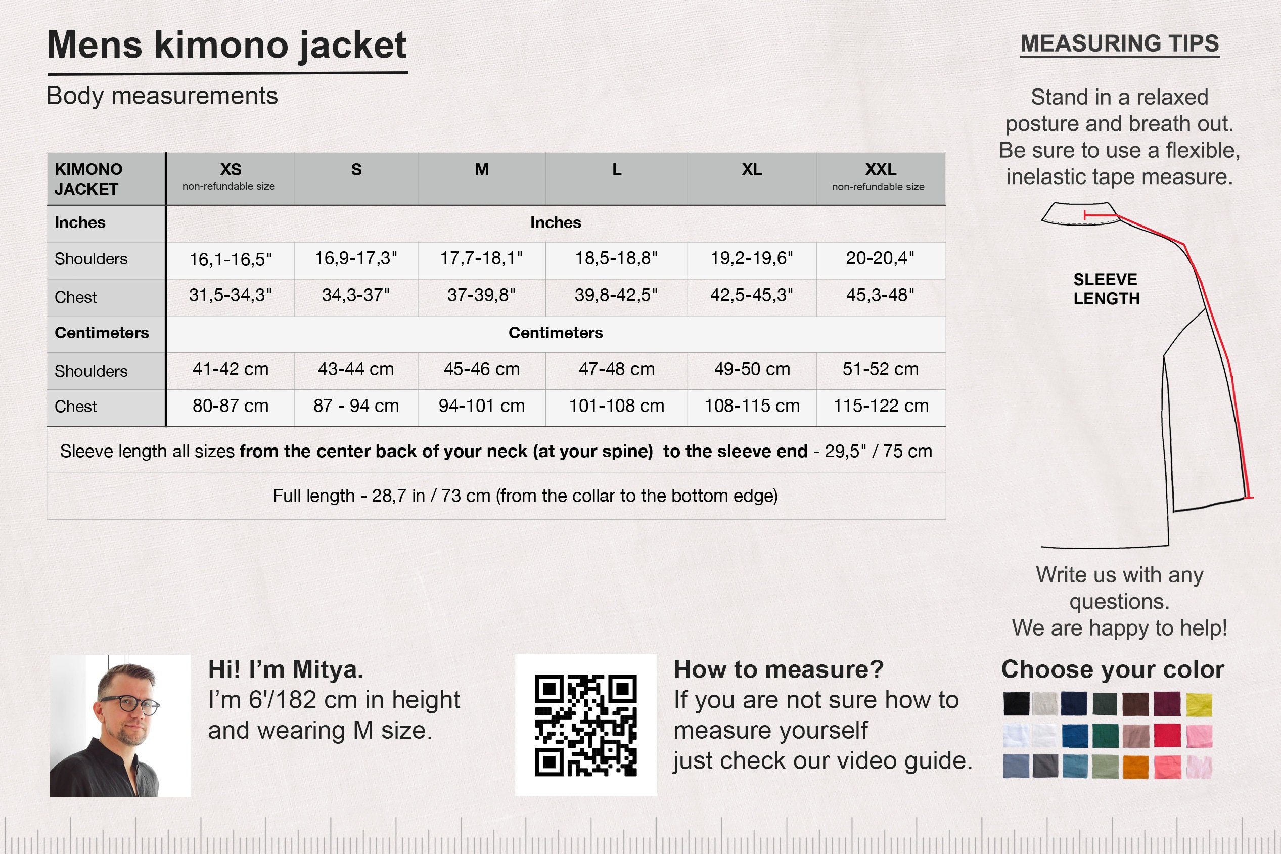 Sleeve length from the center back of your neck (at your spine) – 29,5" / 75 cm