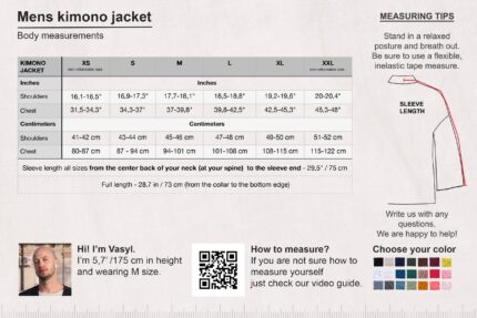 Sleeve length from the center back of your neck (at your spine) – 29,5" / 75 cm