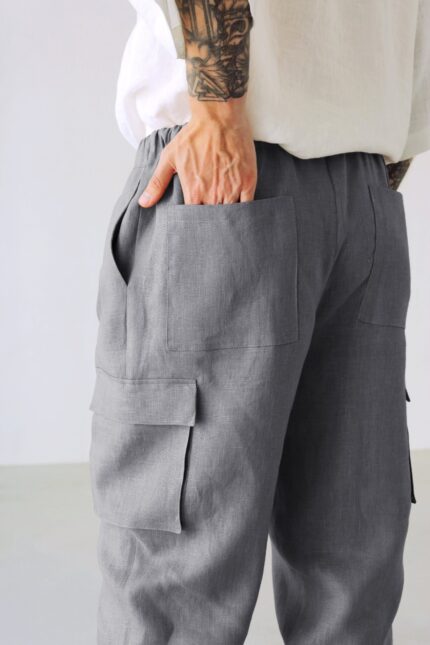Men's cargo linen pants with pockets.