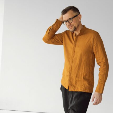 Saffron linen men's hidden botton dress shirt. Gifts for him! Classic handmade men's shirt. Comfortable and stylish men's shirt. Made